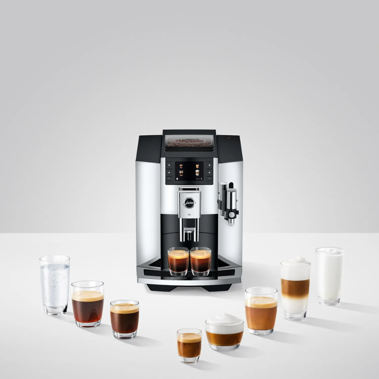 The professional Aroma grinder delivers an optimal grind, state-of-the-art brewing processes unleash the full intensity of the aromas and a fine, creamy milk foam ensures trendy specialities that are more successful than ever. The innovative E8 masters 17 different specialities, from aromatic espresso to the trendy cortado. Long, mild specialities such as caffè Barista and lungo Barista are of coffee bar quality. A new liquid circuit prepares them in the purest barista tradition. For lovers of stronger coffee, the additional Extra Shot function gives cappuccino, flat white and latte macchiato a boost.