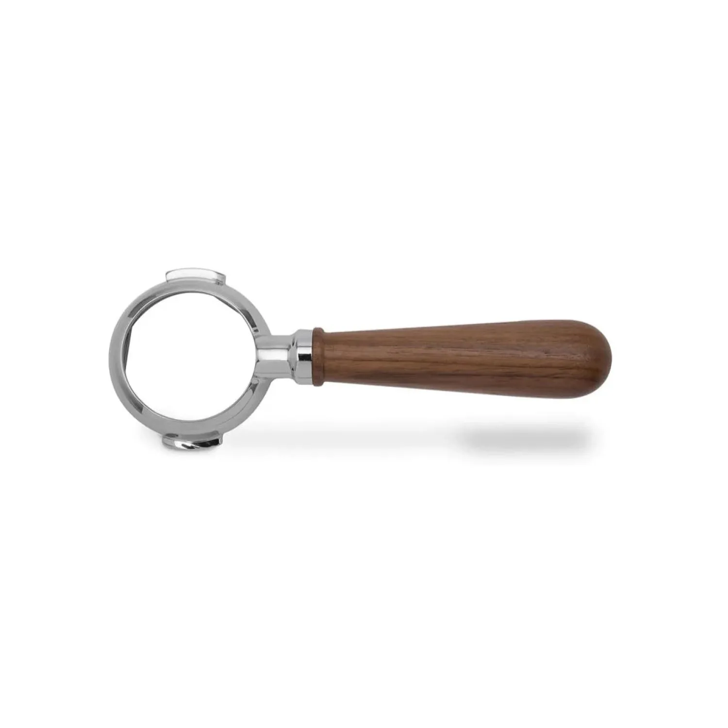 - a 58mm stainless steel bottomless portafilter with angled walnut wood handle