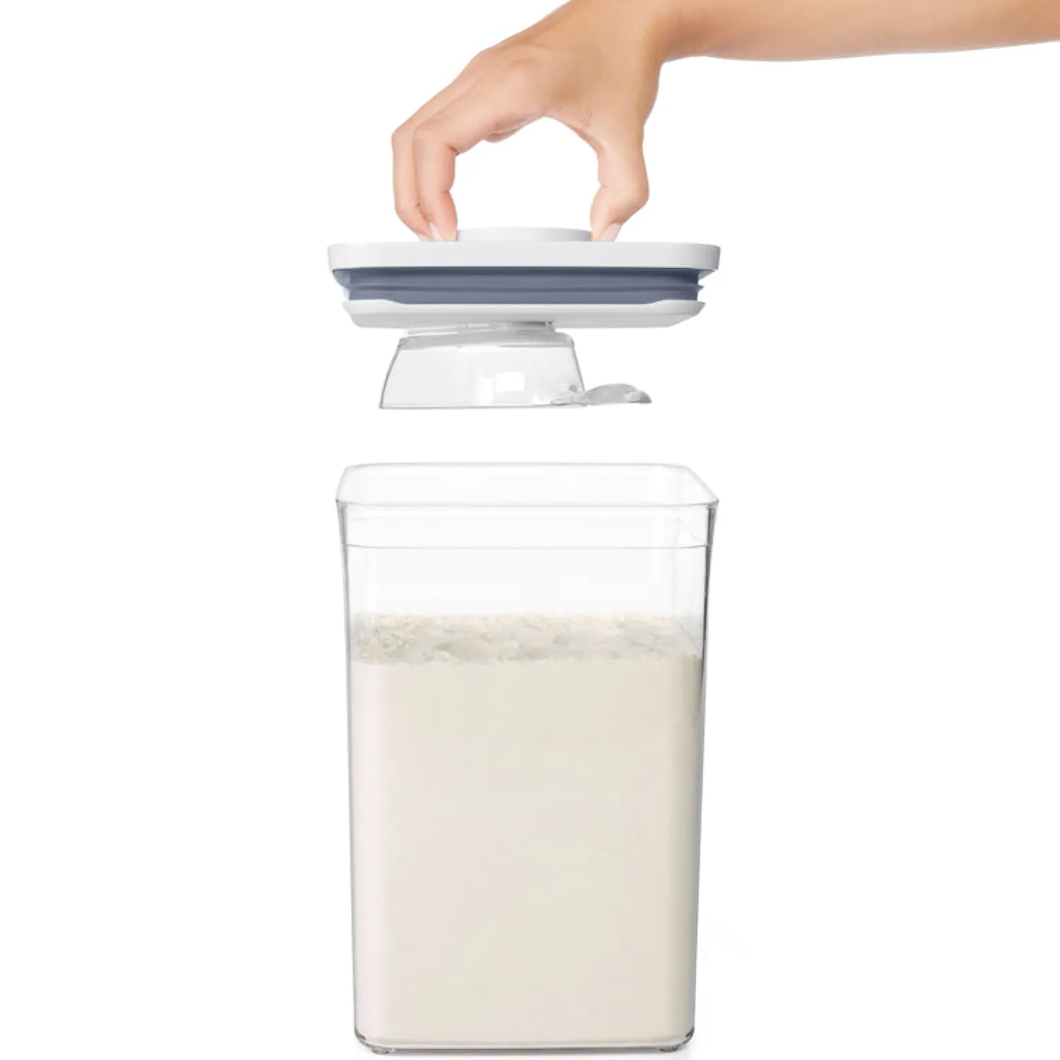 Measuring spoon, sold individually. Half-cup measure, 118 ml / 170 g capacity. Rounded edge allows easy access into corners of containers. Fits all POP storage containers with an accessory lid and securely attaches to the underside of lids.